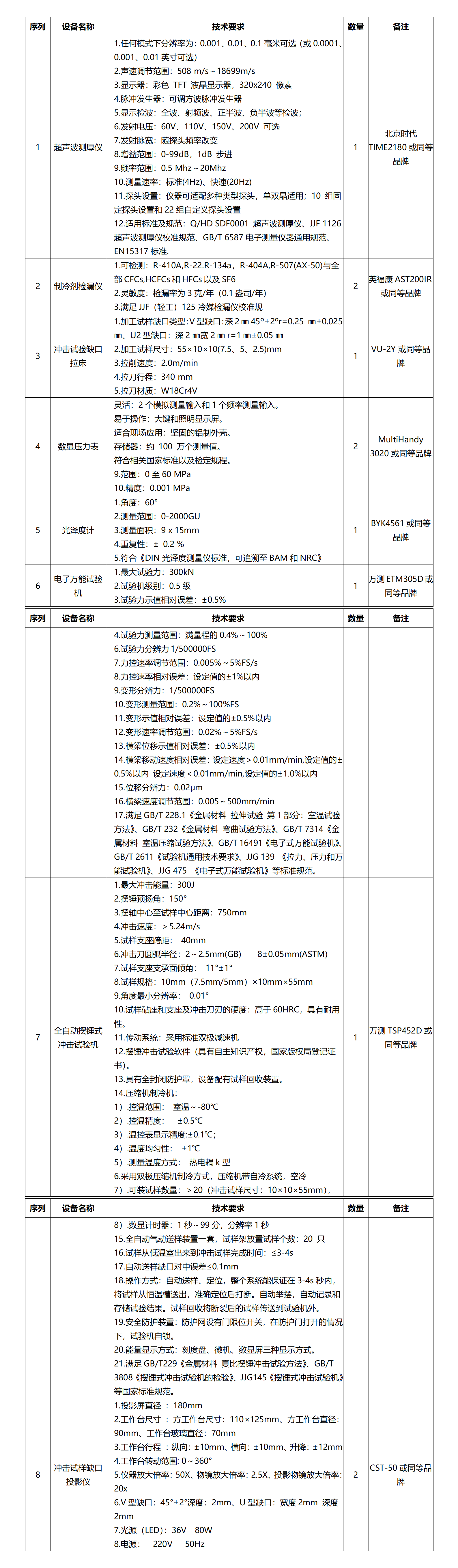 1. 项目名称: 质量部实验设备项目