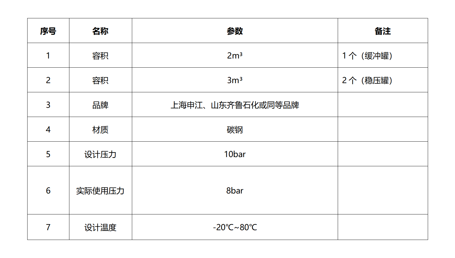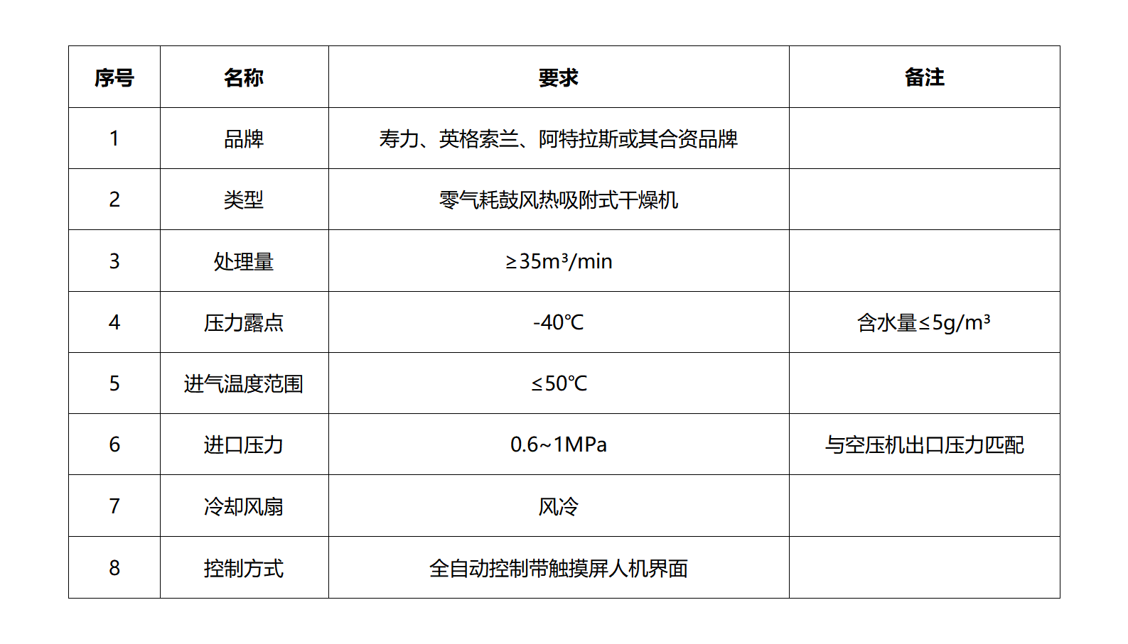 6. 项目概况:二号主机厂空压机房项目,增加空压机智慧管控系统,冷干机、储气罐、管道更新,冷干机更新,具体参数如下表: